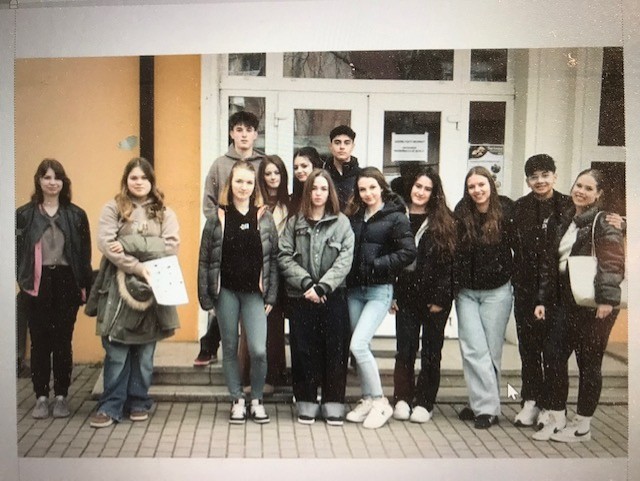 1. fotó: A Baróti Szabó Dávid Technológiai Líceum és az Eötvös Gyakorlóiskola diákönkormányzati képviselőinek csoportképe a baróti középiskola bejárata előtt