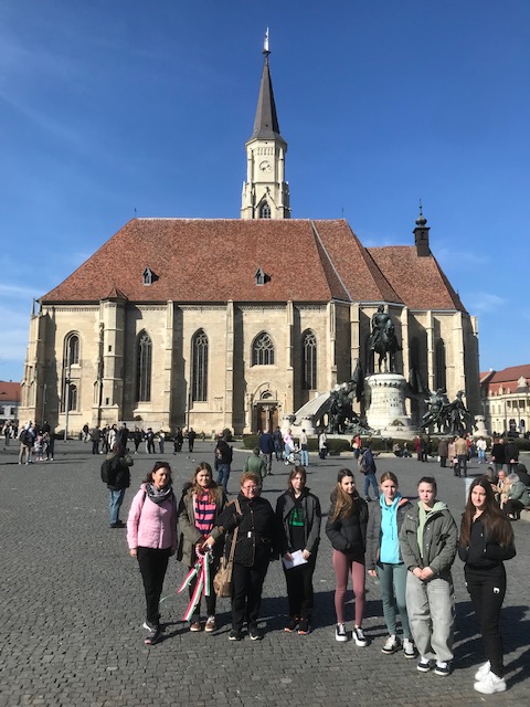 4. fotó: Az Eötvös Gyakorlóiskola csoportja Kolozsvár főterén (Szabadság – tér) a Szent Mihály székesegyház és a Hunyadi – szoborcsoport előtt