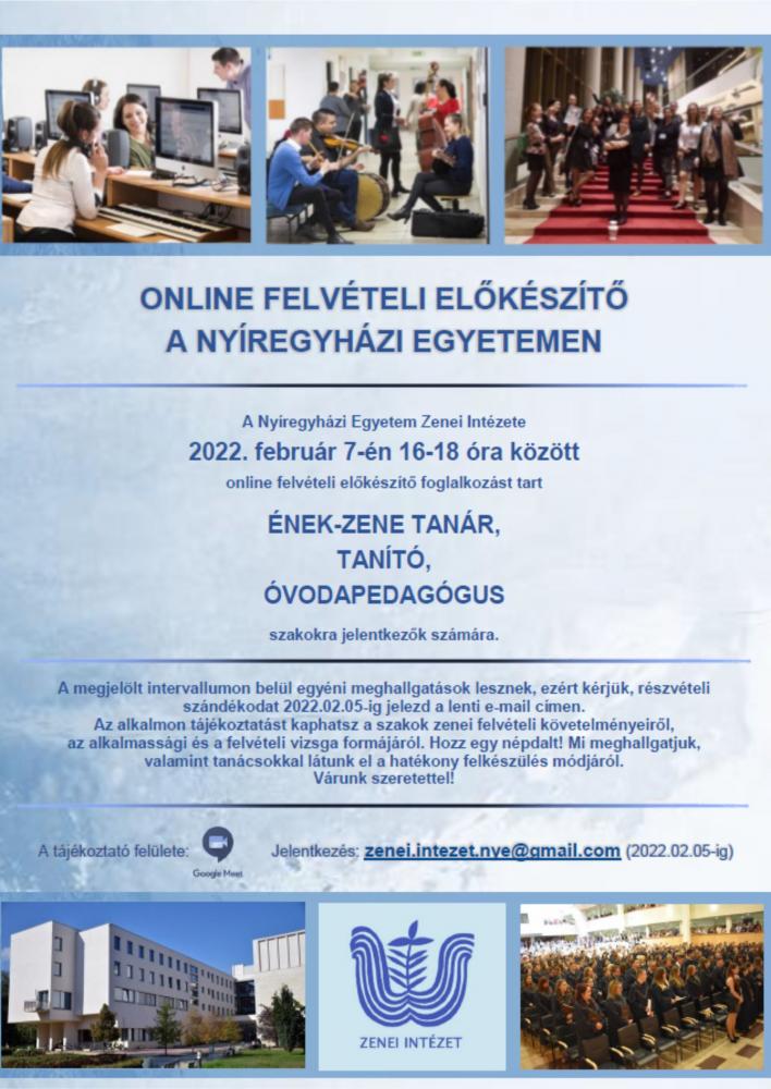 A Nyíregyházi Egyetem Zenei Intézete 2022. február 7-én 16-18 óra között online felvételi előkészítő foglalkozást tart ÉNEK-ZENE TANÁR, TANÍTÓ, ÓVODAPEDAGÓGUS szakokra jelentkezők számára.