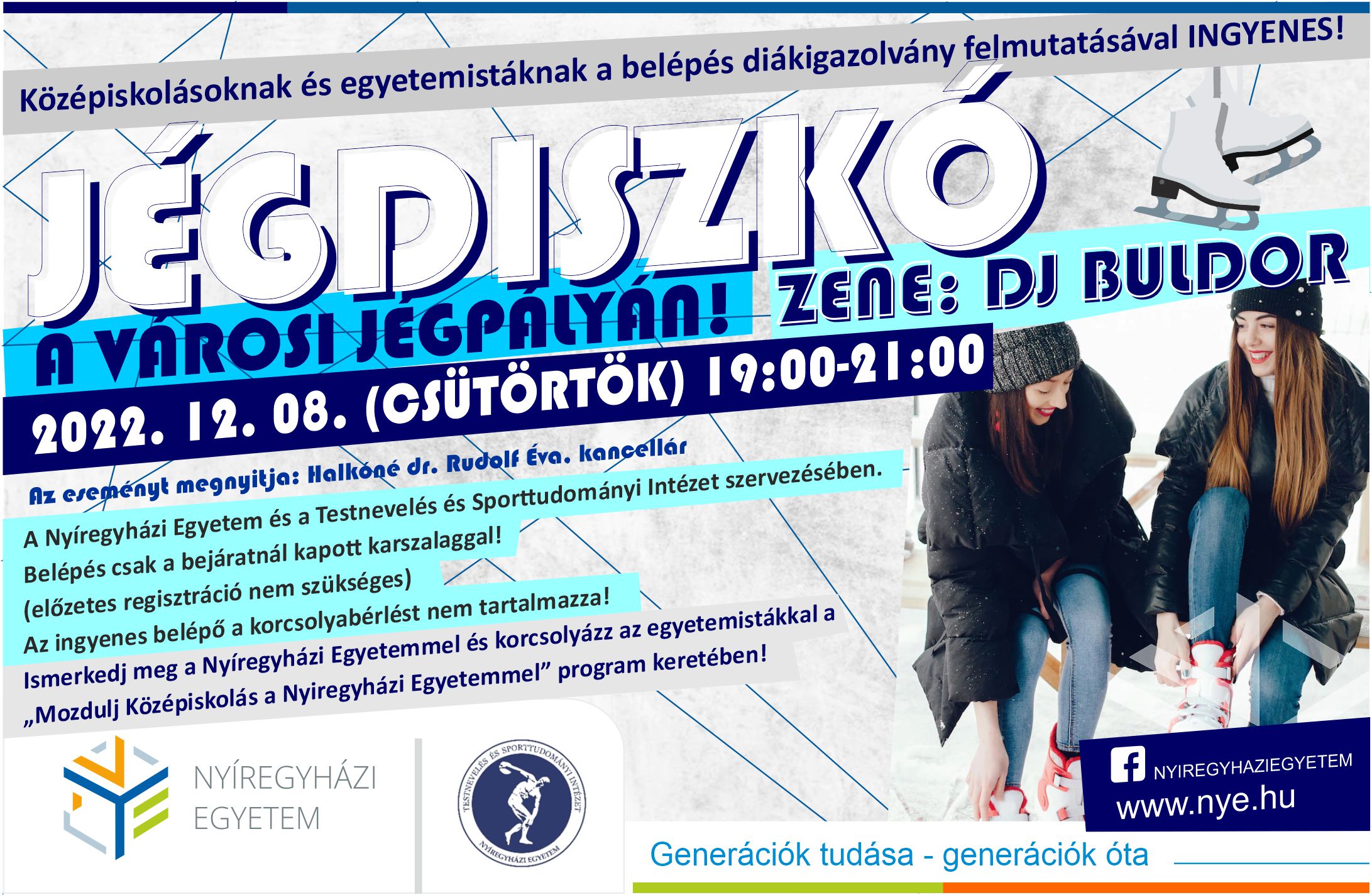A Nyíregyházi Egyetem a „Mozdulj Középiskolás a Nyíregyházi Egyetemmel!” programsorozat keretében a Testnevelés és Sporttudományi Intézet szervezésében Jégdiszkót tart a városi jégpályán 2022. december 8-án (csütörtökön) 19:00-21:00 óra között. A rendezvényt megnyitja Halkóné dr. Rudolf Éva kancellár. Középiskolásoknak és egyetemistáknak a belépés diákigazolvány felmutatásával INGYENES. Belépés csak a bejáratnál kapott karszalaggal (előzetes regisztráció nem szükséges). Az ingyenes belépő a korcsolyabérlést nem tartalmazza!