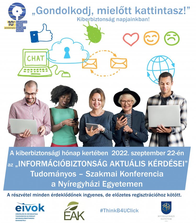 A kiberbiztonsági hónap keretében kerül megrendezésre 2022. szeptember 22-én a HTE Információbiztonsági Szakosztálya – EIVOK, az ÉAK Nonprofit Kft. és a Nyíregyházi Egyetem közös szervezésében „Az információbiztonság aktuális kérdései” című Tudományos – Szakmai Konferencia, amely egyben az EIVOK 28. információbiztonsági szakmai fóruma is. A konferencián olyan aktuális információbiztonsági témakörök lesznek ismertetve, mint például a városi internetszolgáltatás biztonsága, az orosz-ukrán háború kiberteret érintő tanulságai, a jövő közlekedésbiztonsága, illetve, hogy mik az alapvető információbiztonsági feladatok egy munkaszervezetben. Emellett az előadók bemutatják a Nyíregyházi Egyetem IT biztonsággal kapcsolatos tevékenységeit is.