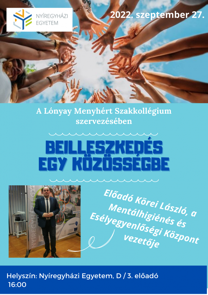A Lónyay Menyhért Szakkollégium szervezésében Körei László, a Mentálhigiénés és Esélyegyenlőségi Központ vezetője tart előadást BEILLESZKEDÉS EGY HALLGATÓI KÖZÖSSÉGBE címmel.