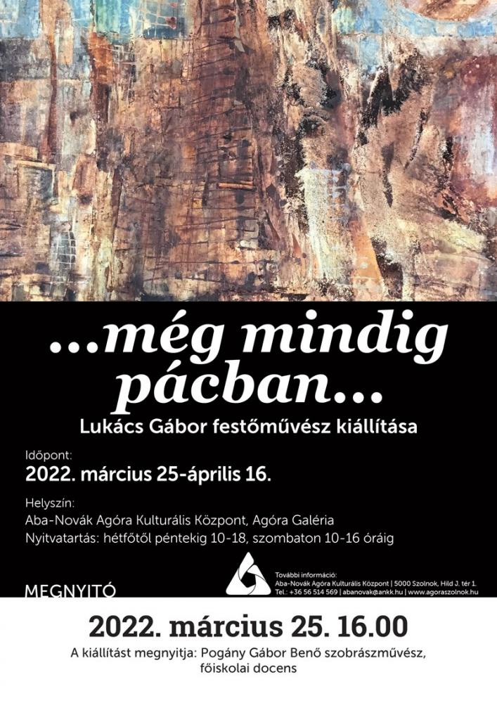 ...még mindig pácban címmel 2022. március 25-én nyílik Lukács Gábor festőművész kiállítása az Aba-Novák Agóra Kulturális Központ, Agóra Galériájában (Szolnok). Az eseményen megnyitót mond Pogány Gábor Benő, szobrászművész, főiskolai docens. A kiállítás április 16-ig tekinthető meg.