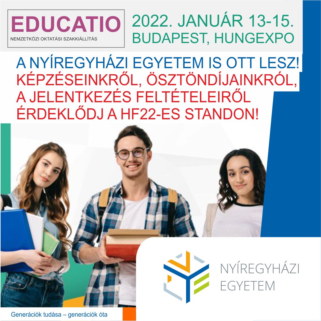 Minden magyar felsőoktatási intézmény jelen lesz az Educatio oktatási szakkiállításon, és a határon túli intézményeket is meghívták - mondta az Innovációs és Technológiai Minisztérium (ITM) felsőoktatásért felelős helyettes államtitkára szerda reggel az M1 aktuális csatornán. A Nyíregyházi Egyetem is jelen lesz a rendezvényen, így csütörtökön, pénteken és szombaton is várják az érdeklődőket az egyetem oktatói, munkatársai, hallgatói. Az intézmény képzéseiről, ösztöndíjairól a HF22-es standnál érdeklődhetnek a látogatók.