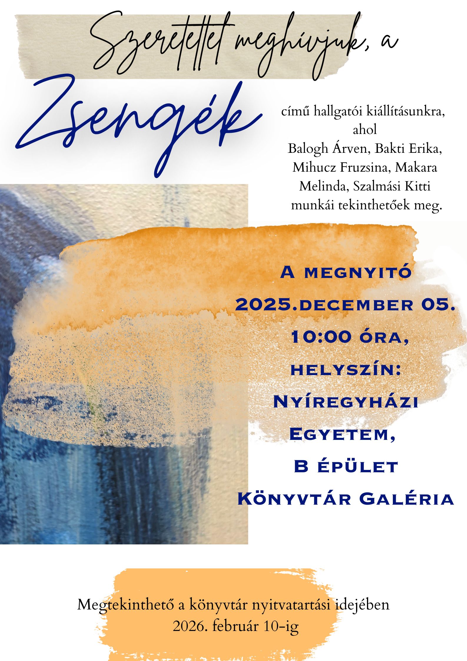 A Zsengék című kiállítás a Festészet kurzus tehetséges hallgatóinak munkáit mutatja be. A tárlaton Bakti Erika, Balogh Árven, Makara Melinda, Mihucz Fruzsina és Szalmás Kitti legújabb festményei láthatók, amelyek a festészeti foglalkozások, valamint az otthoni alkotófolyamatok során készültek. A kiállítást a kurzus vezetőjeként Piti Zsuzsanna, festőművész, a Vizuális Kultúra Intézet oktatója nyitja meg december 5-én, pénteken 10.00 órakor. A tárlat megrendezését a Nyíregyházi Egyetem Kulturális Albizottsága támogatta. A művek február 10-ig tekinthetők meg a könyvtár nyitvatartási idejében.
