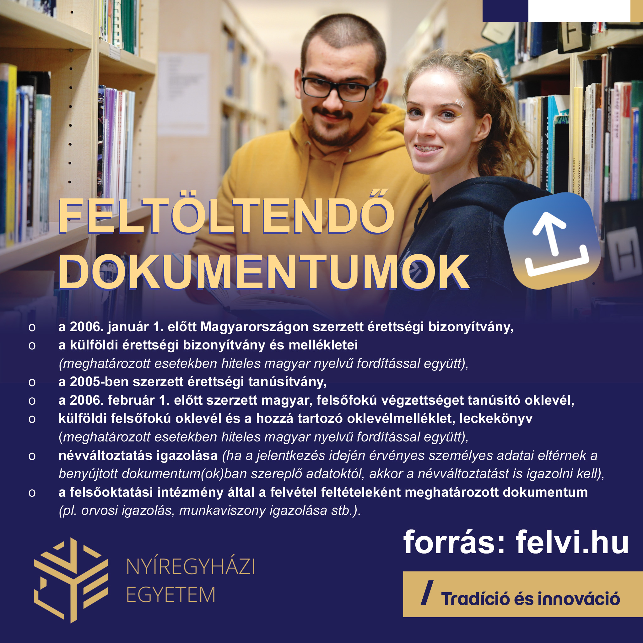 Ahogyan a felvi.hu-n is megtalálható, a kötelezően feltöltendő dokumentumok, elsősorban a végzettségeket és eredményeket igazoló okiratok: