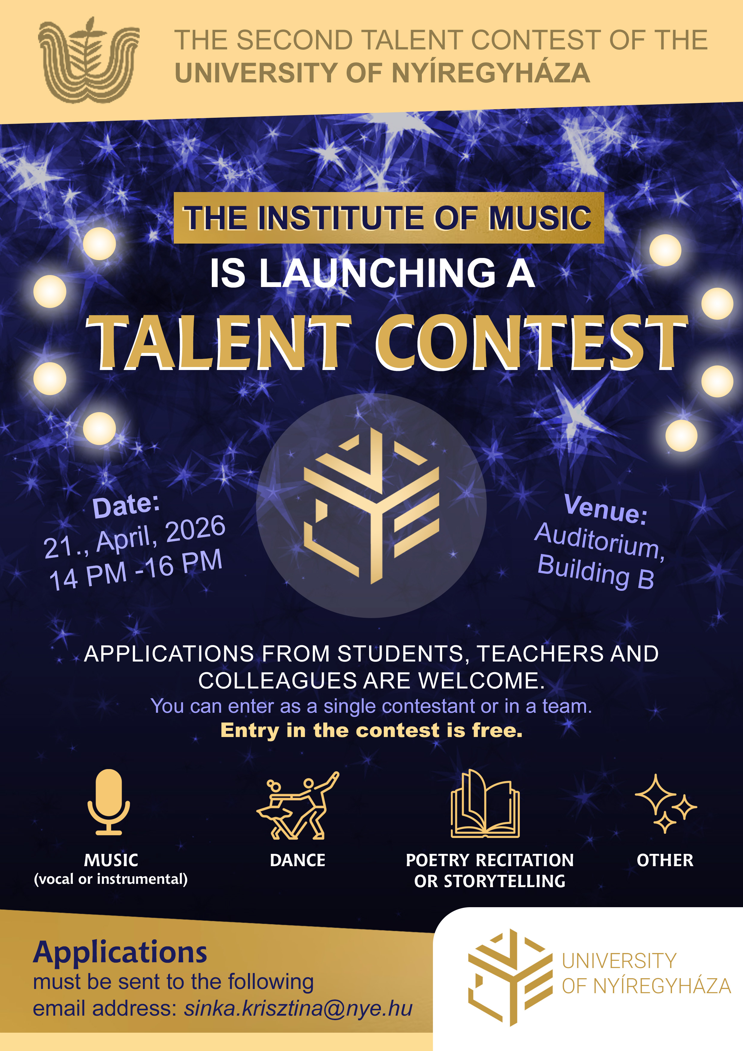 A Nyíregyházi Egyetem Zenei Intézete idén tavasszal hagyományőrző módon második alkalommal szervez „KI MIT TUD?" tehetségkutató versenyt.