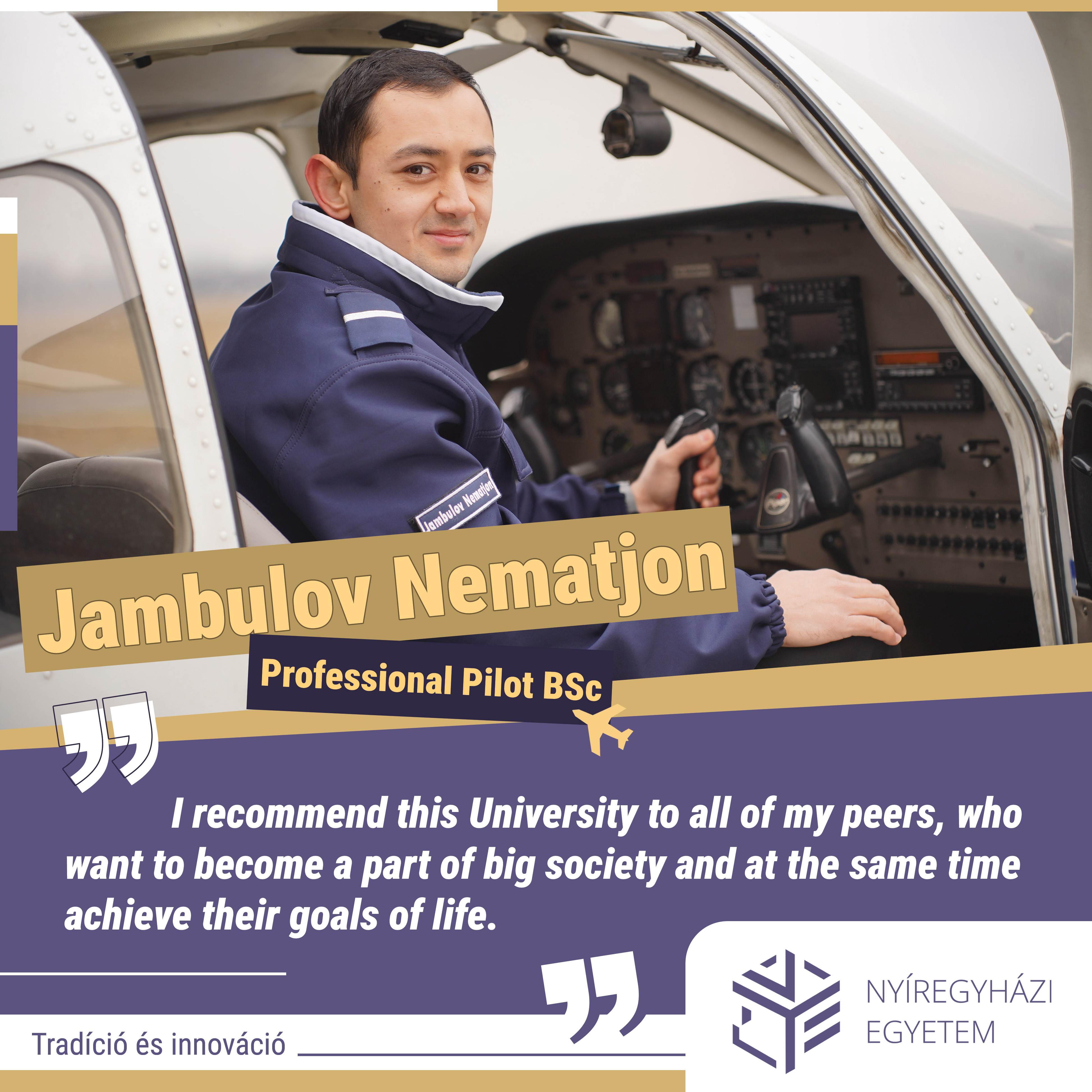 Nematjon Jambulov. Az Üzbegisztánból érkezett másodéves hallgató pilótának tanul. Családi tervei is szorosan kapcsolódnak Nyíregyházához. Felesége ugyanis ösztöndíjra pályázik, hogy a következő tanévet már az egyetem hallgatójaként kezdhesse el. (Cikk: