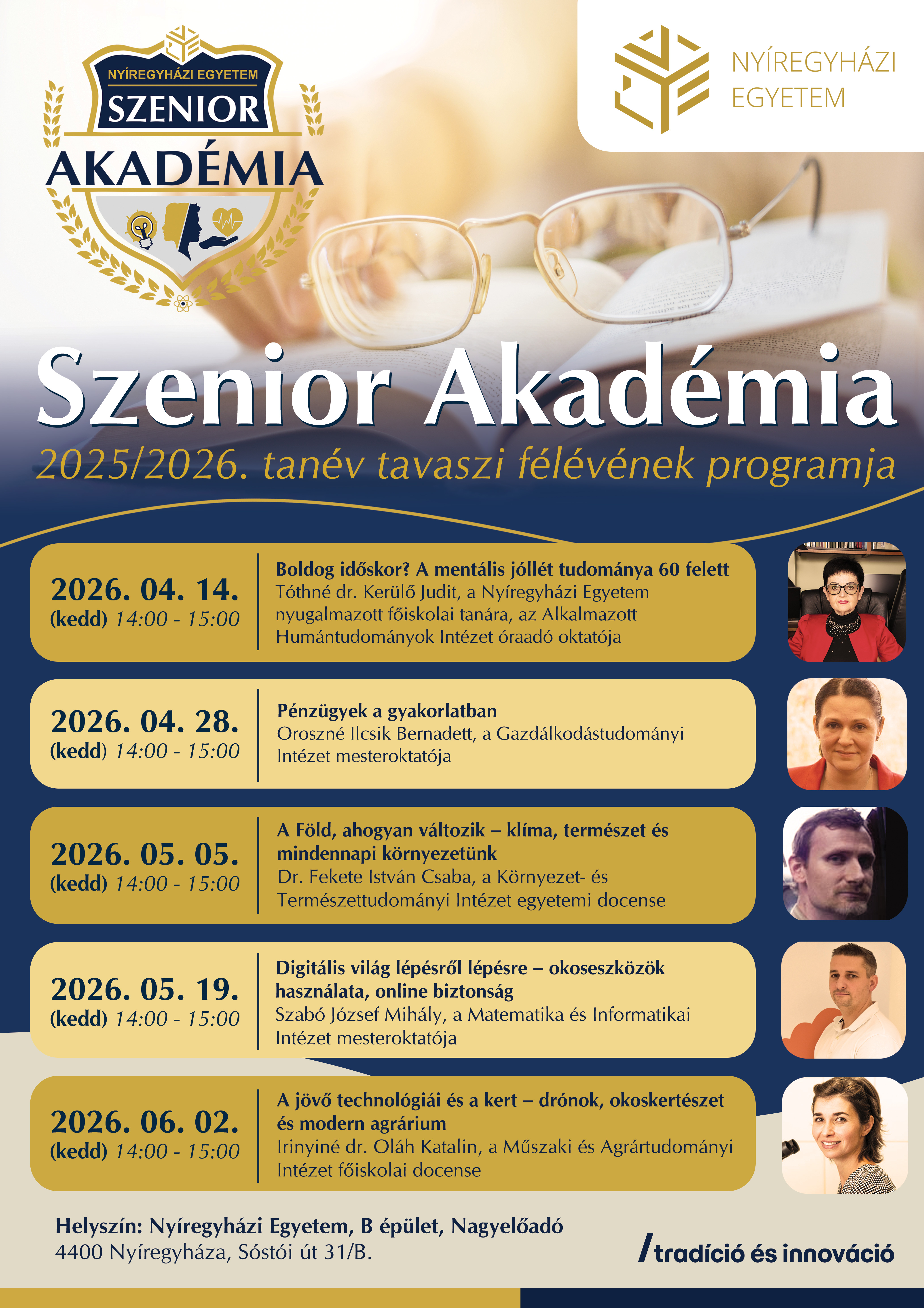 Mentális jóllét, pénzügyek a gyakorlatban, okoseszközök használata - többek között ilyen témákkal folytatódik a Szenior Akadémia programja a Nyíregyházi Egyetem 2025/2026-os tanévének tavaszi félévében. A havi rendszerességgel megrendezett eseménysorozat az élethosszig tartó tanulás jegyében kínál ismeretterjesztő előadásokat az idősebb korosztály számára. Célja, hogy a résztvevők közérthető, élményalapú formában találkozhassanak az egyetem oktatóinak tudományos és gyakorlati ismereteivel. A program az intézmény fontos közösségépítő és értékteremtő kezdeményezése is egyben, amely szándéka szerint erősíti az egyetem és a helyi társadalom kapcsolatát.