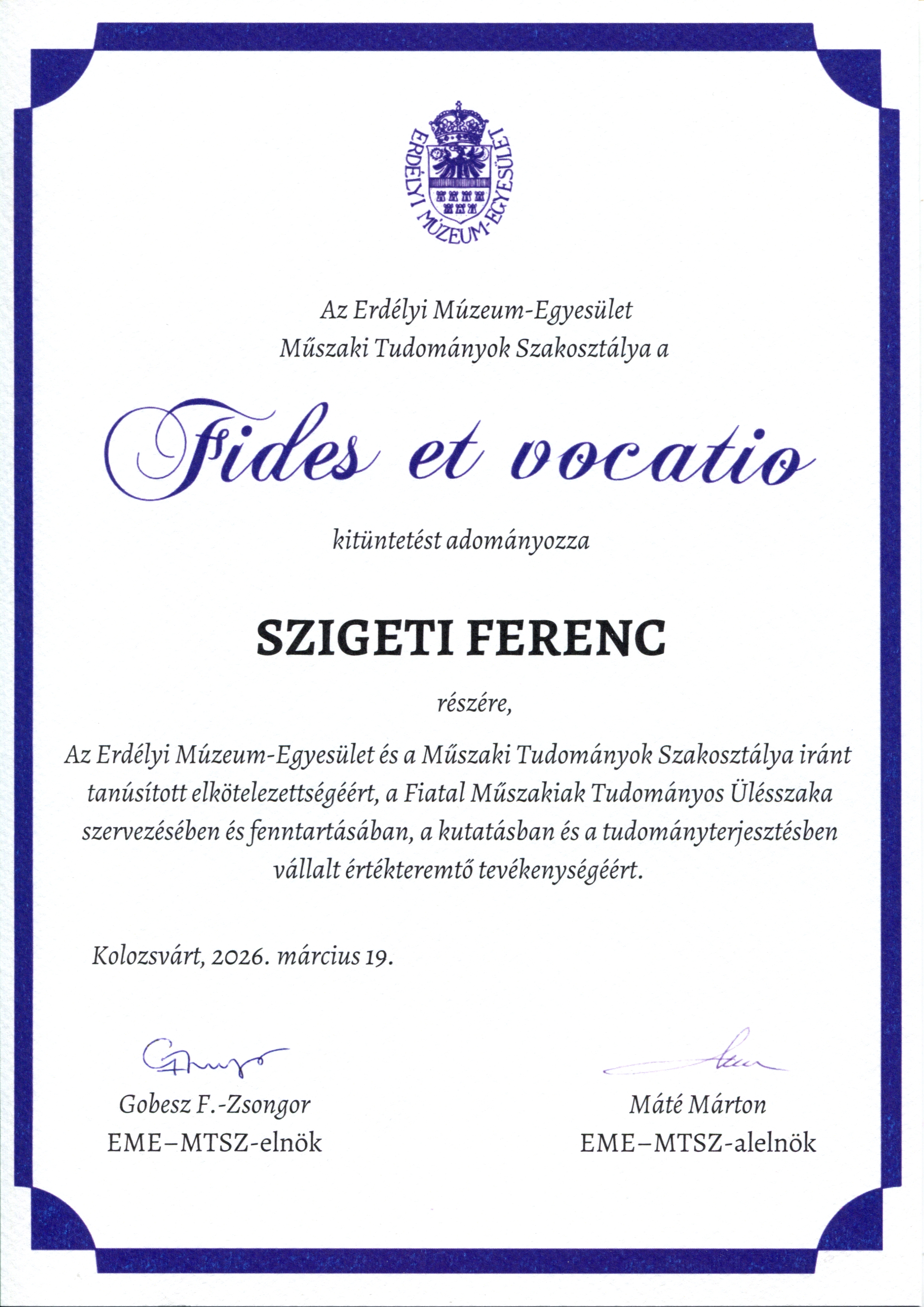 „Fides et vocatio” (Hit és hivatás) kitüntetést kapott Szigeti Ferenc, a Nyíregyházi Egyetem Műszaki Alapozó, Fizika és Gépgyártástechnológia Intézeti Tanszék vezetője az Erdélyi Múzeum-Egyesület Műszaki Tudományok Szakosztálya iránt tanúsított elkötelezettségéért, a Fiatal Műszakiak Tudományos Ülésszaka szervezésében és fenntartásában, a kutatásban és a tudományterjesztésében vállalt értékteremtő tevékenységéért.