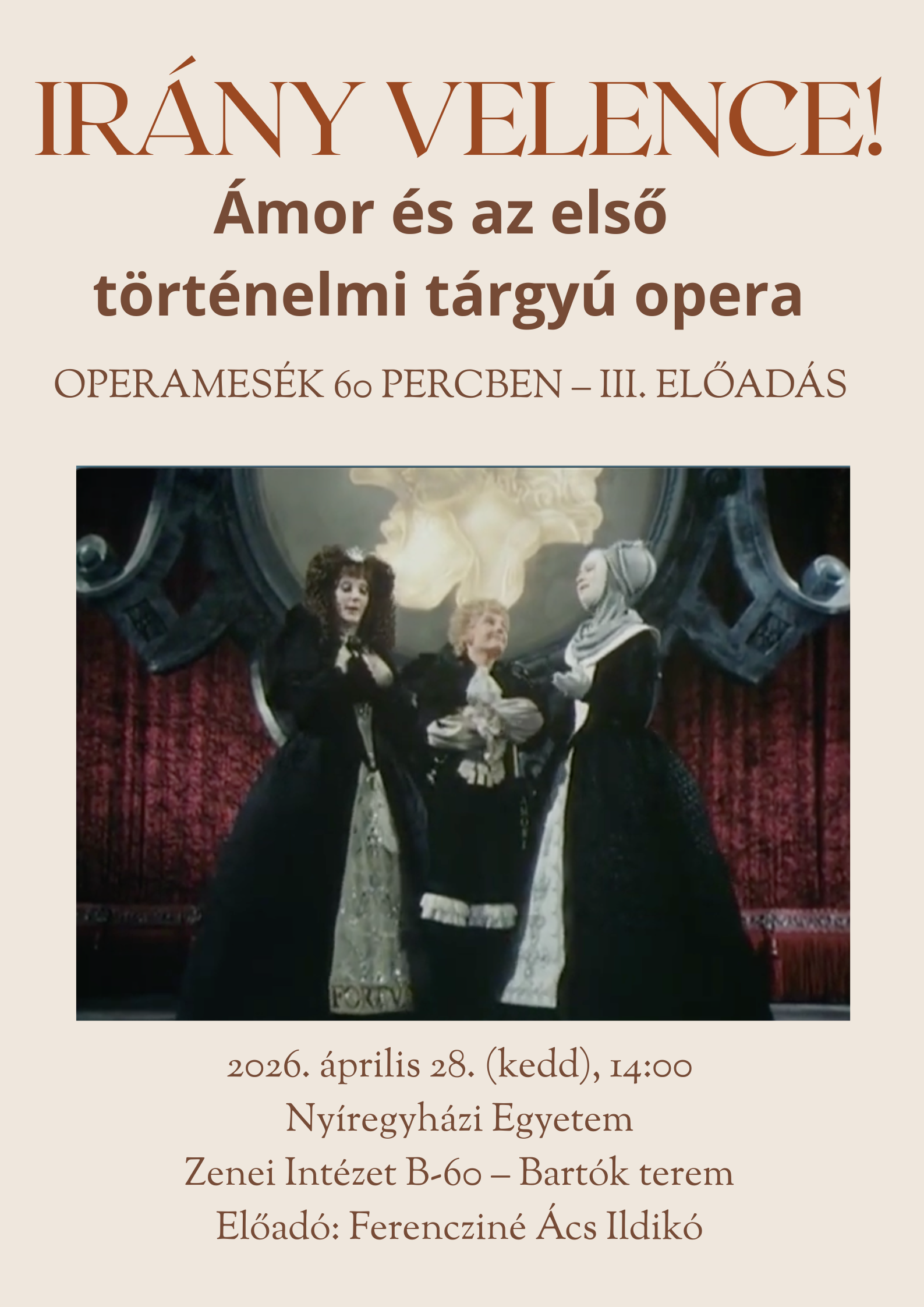 Ámor és az első történelmi tárgyú opera című előadására várja az érdeklődőket Ferencziné dr. habil. Ács Ildikó, a Nyíregyházi Egyetem Zenei Intézetének főiskolai tanára.