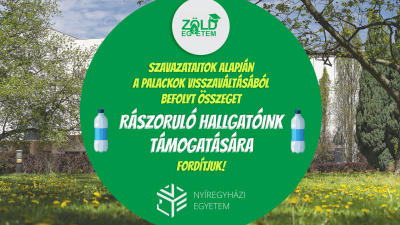 Lezárult a Nyíregyházi Egyetem PET-palack gyűjtésének szavazása: a visszaváltott palackokból befolyó támogatási összeggel a rászoruló hallgatókat segíti az intézmény közössége.A november végén zárult online szavazáson közel ötszázan mondták el javaslataikat a jótékonysági akcióról és annak céljáról. A megadott támogatási lehetőségek közül a legtöbben (211-en) a rászoruló hallgatók megsegítését választották a voksolók.