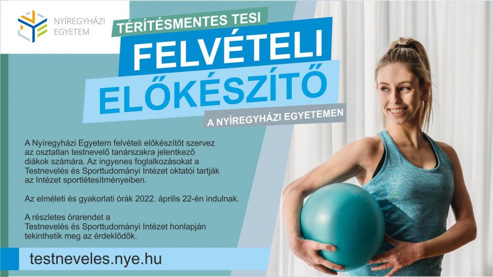 A Nyíregyházi Egyetem felvételi előkészítőt szervez az osztatlan testnevelő tanárszakra jelentkező diákok számára. Az ingyenes foglalkozásokat a Testnevelés és Sporttudományi Intézet oktatói tartják az Intézet sportlétesítményeiben. Az elméleti és gyakorlati órák 2022. április 22-én indulnak. A részletes órarendet a Testnevelés és Sporttudományi Intézet honlapján tekinthetik meg az érdeklődők.