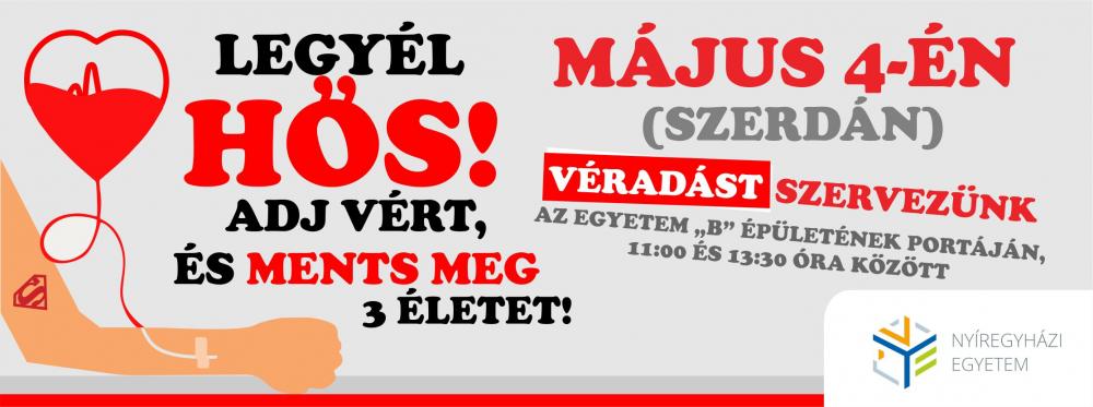 Újra egyetemi véradás! Május 4-én (szerdán) várják a véradókat a Nyíregyházi Egyetemen. Az egyetem, a Magyar Vöröskereszt Szabolcs-Szatmár-Bereg Megyei Szervezete és az Országos Vérellátó Szolgálat által szervezett véradásra 11:00-13:30 óra között érkezhetnek a segítő szándékú véradók, hallgatók, dolgozók, oktatók a "B" tanulmányi épület bejáratánál, a szokásos helyszínen.