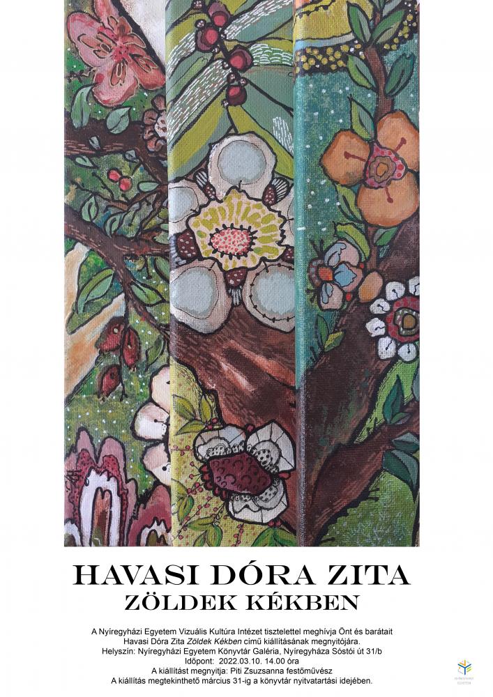 A Nyíregyházi Egyetem Vizuális Kultúra Intézete tisztelettel meghívja az érdeklődőket Havasi Dóra Zita Zöldek Kékben című kiállításának megnyitójára.